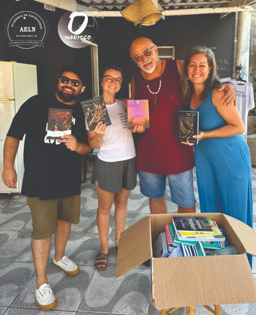 Na foto, da direita para a esquerda: Léo Monassa e Helena Weber, representantes da Biblioteca Comunitária Luli Luz, o acadêmico Ivan Therra e a Profª. Me. Lizzi Barbosa, da Casa de Cultura do Litoral.